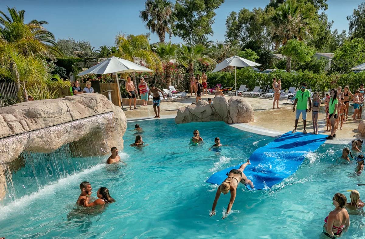 Het zwembadcomplex van camping Gavina is aantrekkelijk ingericht met palmbomen, vlotten, waterval en waterjets. Het maximaal 1.40 m diepe zwembad en het bubbelbad liggen er uitnodigend bij. Voor de jongste bezoekers is er een peuterbad. Dat wordt genieten van de Spaanse zon op een van de ligstoelen bij het zwembad.