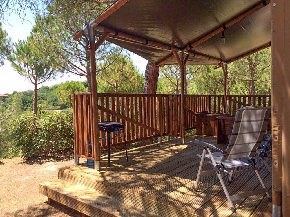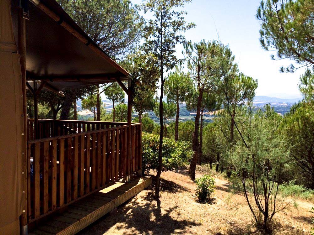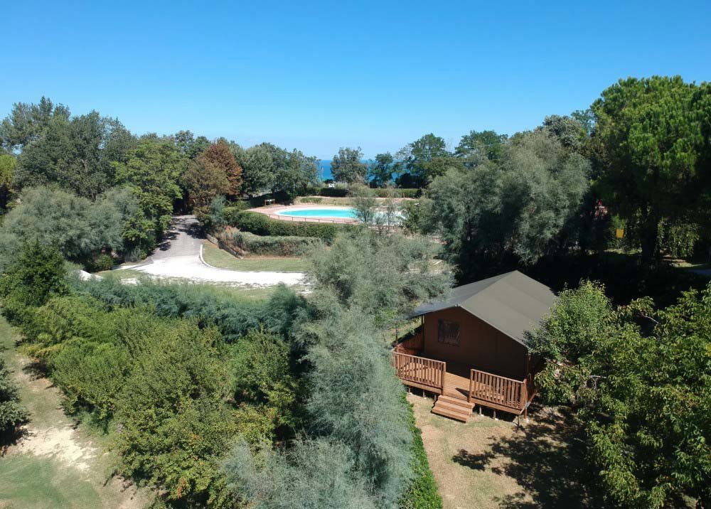 Op deze Italiaanse camping zijn ruim 100 kampeerplaatsen verspreid over 5 terassen. Meestal schaduwrijk onder bomen en struiken. De safaritenten/lodgetenten met eigen badkamer staan op een apart plateau met mooi uitzicht.